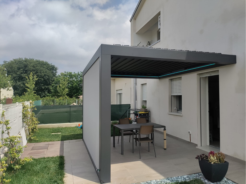 Le lamelle orientabili permettono di gestire luce e ventilazione con facilità, mentre la parete laterale integrata garantisce privacy e protezione dal vento e dal sole. L’illuminazione LED perimetrale completa l’ambiente, rendendolo accogliente anche di sera.