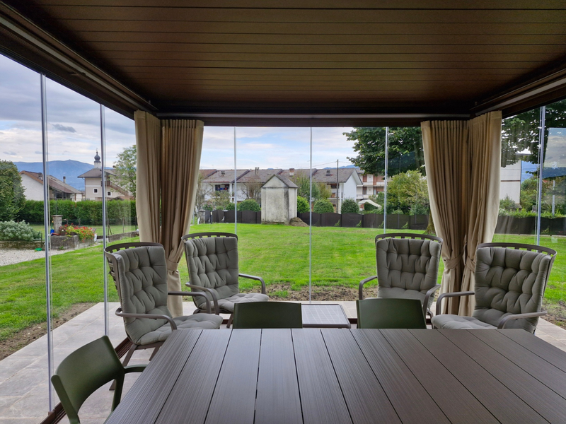 La zona chiusa è stata rifinita con pareti perimetrali e vetrate scorrevoli che offrono una vista ampia sul giardino, mantenendo l’ambiente sempre luminoso. All’interno, le tende garantiscono privacy quando necessario, creando un’atmosfera elegante e confortevole.