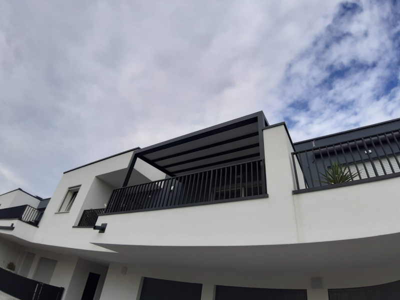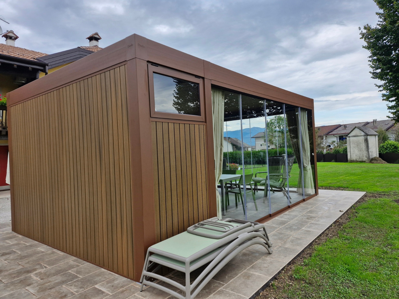 Descrizione: In questa realizzazione abbiamo trasformato una pergola bioclimatica in una casetta moderna e luminosa, creando uno spazio protetto da vivere in ogni stagione. Grazie all’aggiunta di due colonne, la struttura ospita una parte a copertura fissa e una mobile, perfettamente integrate tra loro.