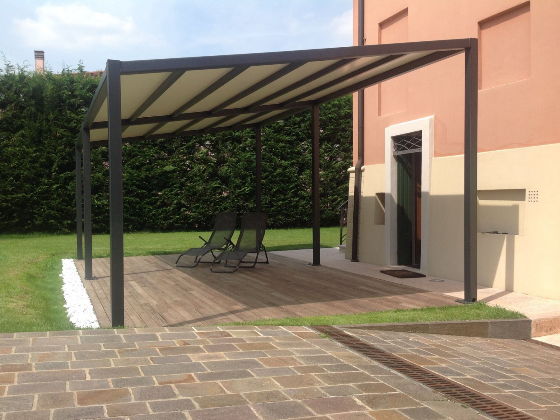 Nelle pergole con telo fisso, le chiusure laterali più comunemente adottate sono i frangisole fissi, rispetto a sistemi scorrevoli come tende a rullo zip o vetrate, garantendo protezione e ventilazione ottimale.
