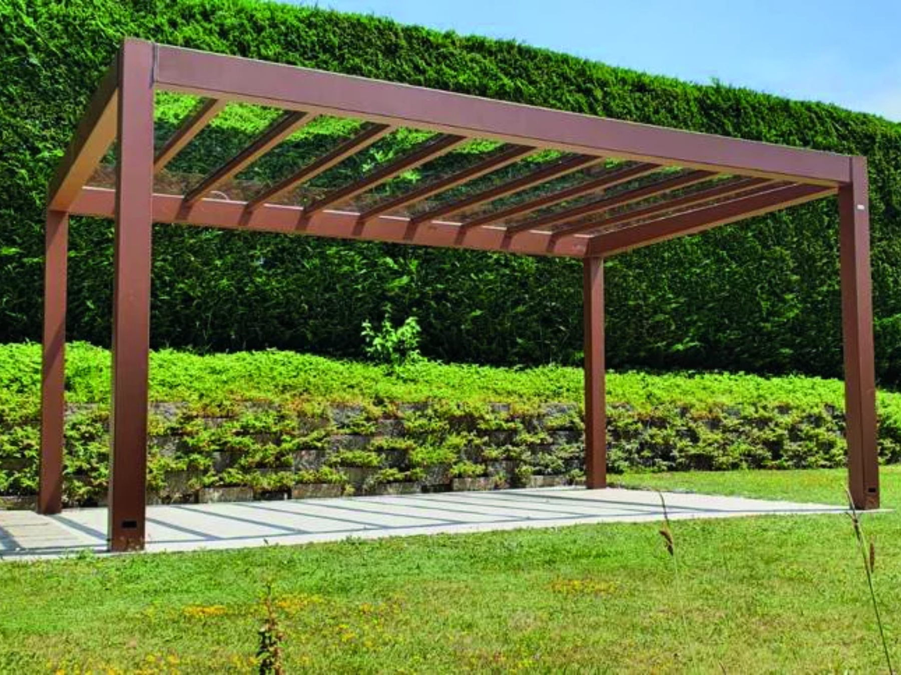 La copertura in policarbonato offre protezione affidabile da pioggia e agenti atmosferici, mantenendo gli spazi luminosi e accoglienti.