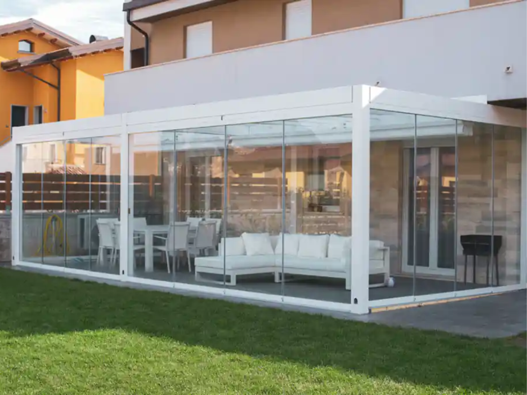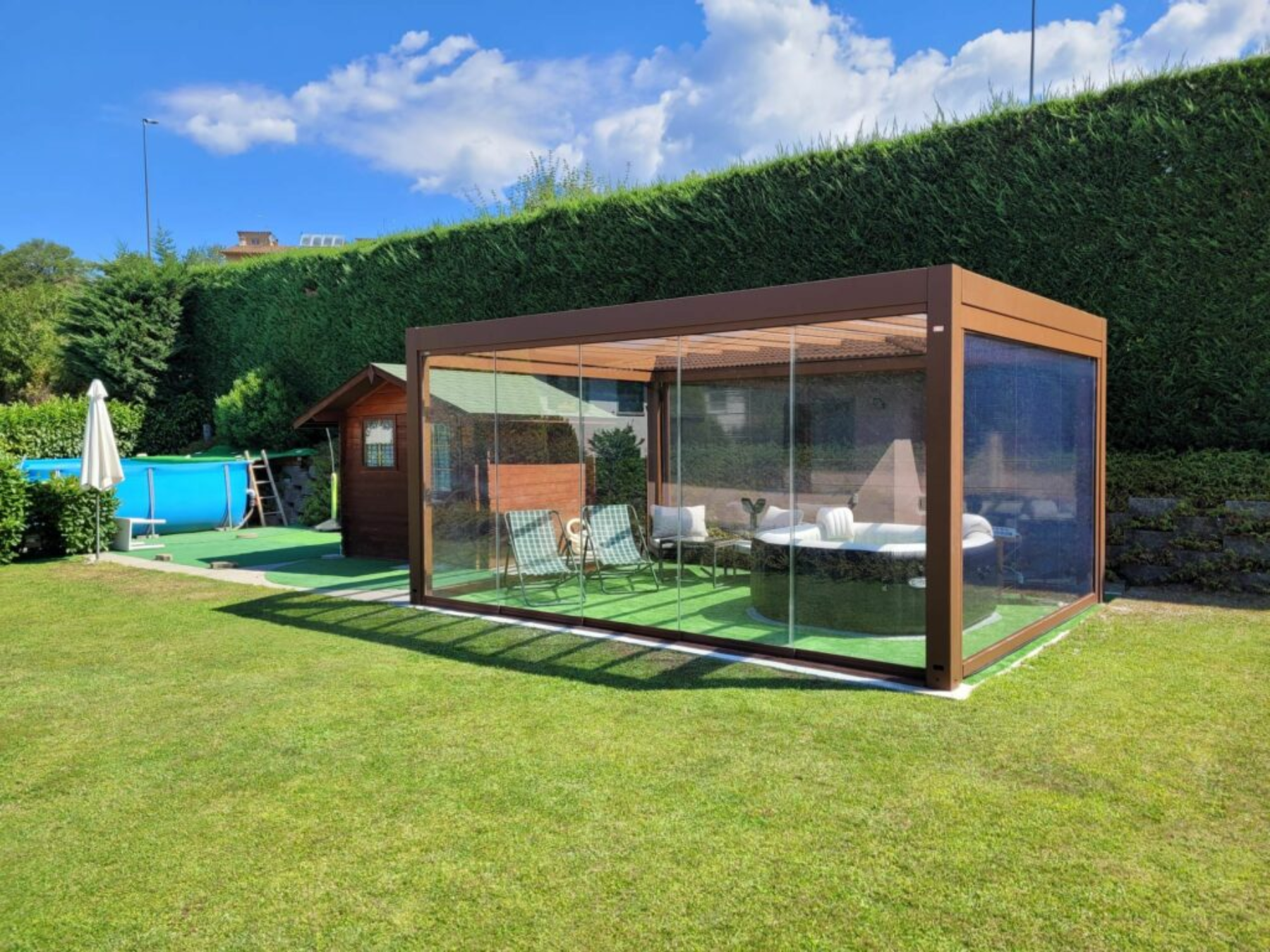La copertura in policarbonato e la gronda integrata garantiscono protezione efficace in ogni stagione, mentre la possibilità di chiudere e personalizzare ogni lato consente di trasformare lo spazio esterno in un ambiente su misura, da vivere in ogni momento dell’anno.