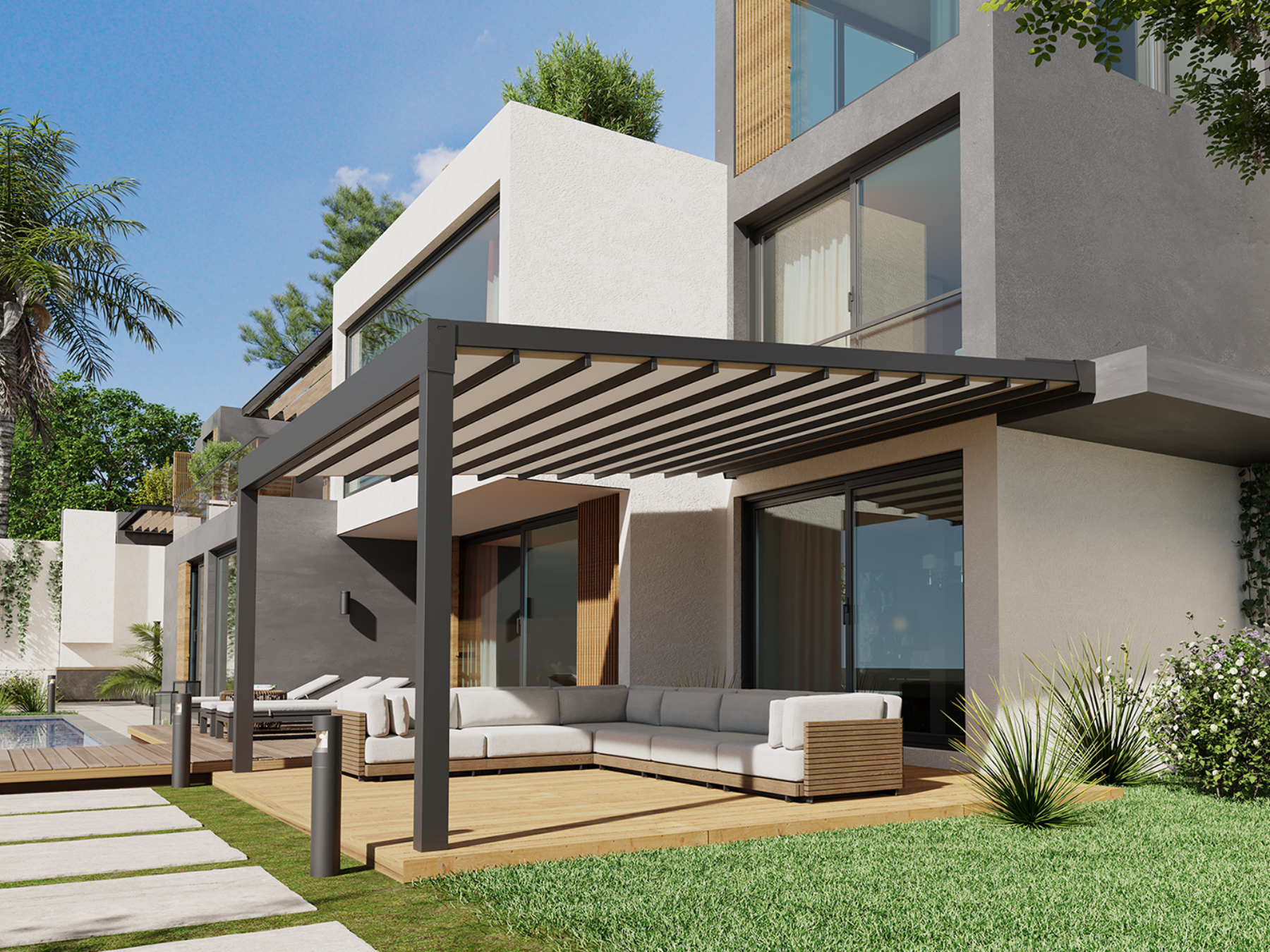 New Lipari è la tenda a pergola progettata per offrire protezione e comfort in ogni stagione. La copertura in PVC oscurante e ignifugo assicura riparo efficace da sole, vento e pioggia, mentre la struttura in alluminio laccato garantisce resistenza alla corrosione e lunga durata nel tempo.