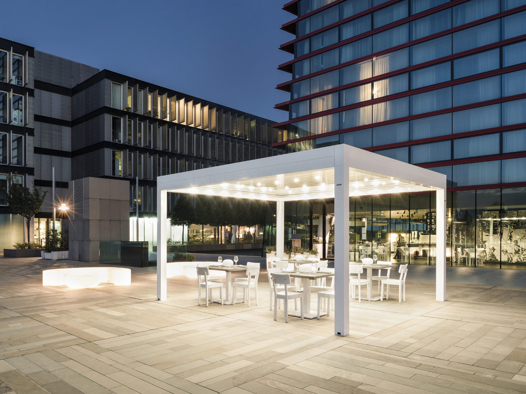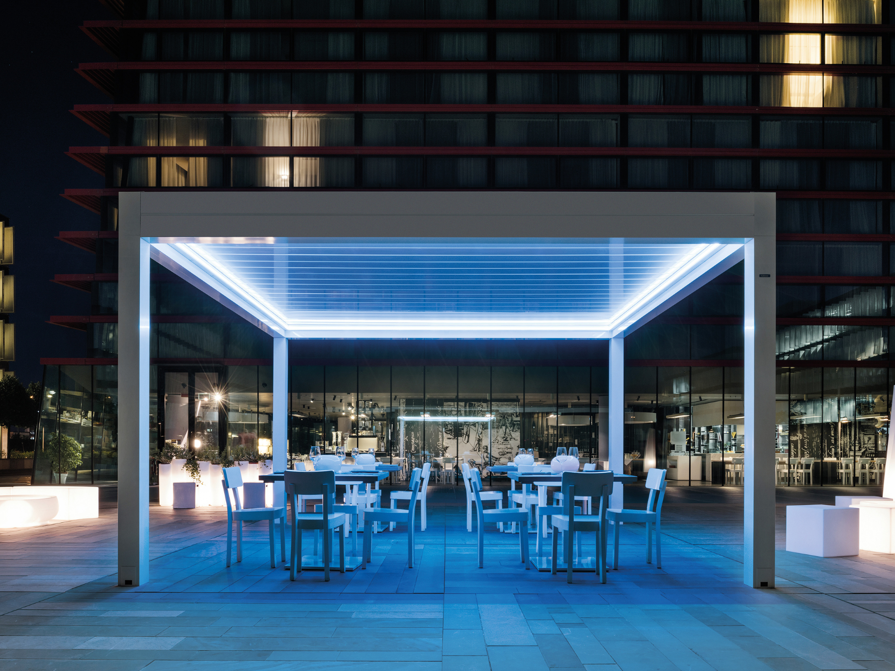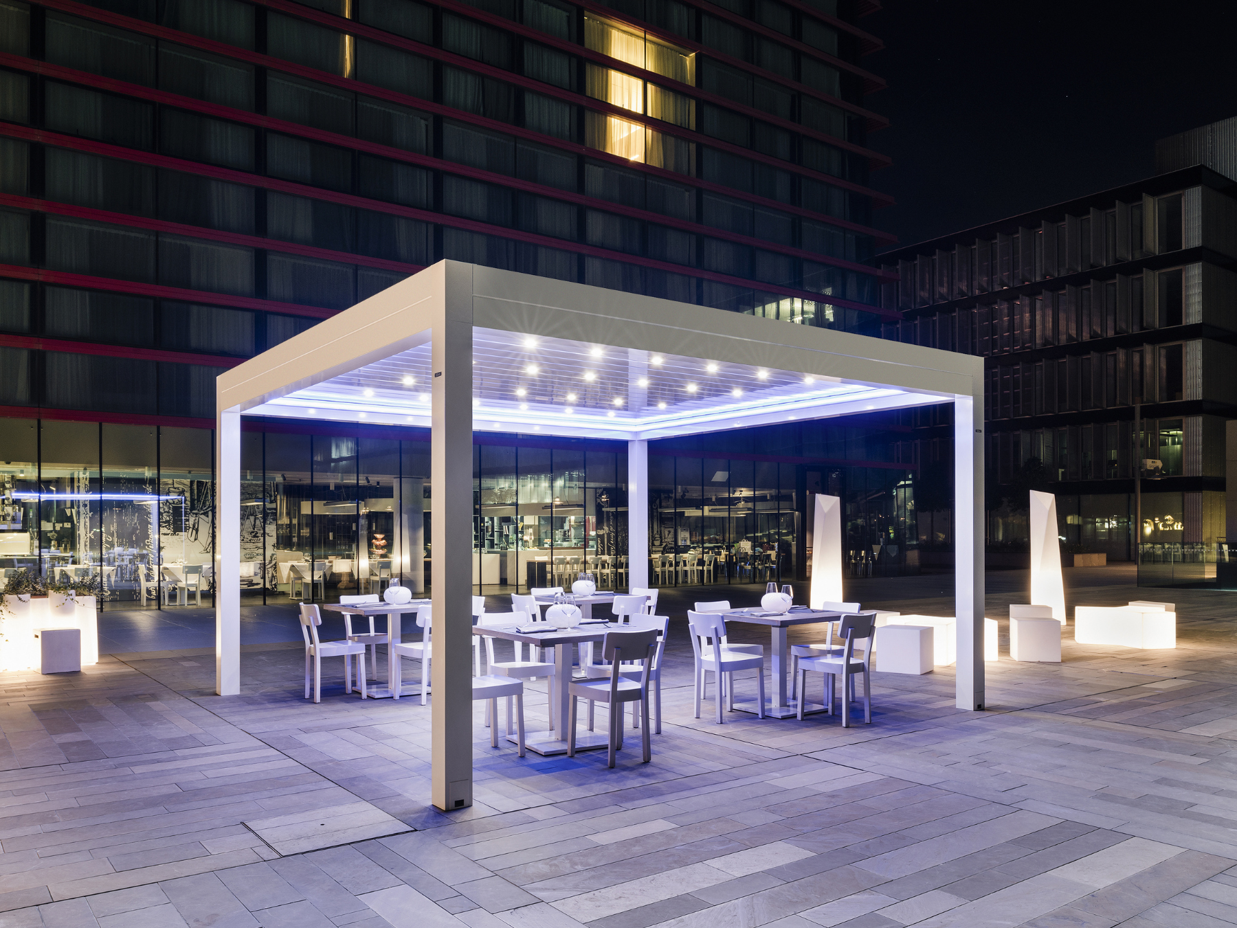L’elemento distintivo è la copertura a lame orientabili, progettata per adattarsi alle diverse esigenze metereologiche.
