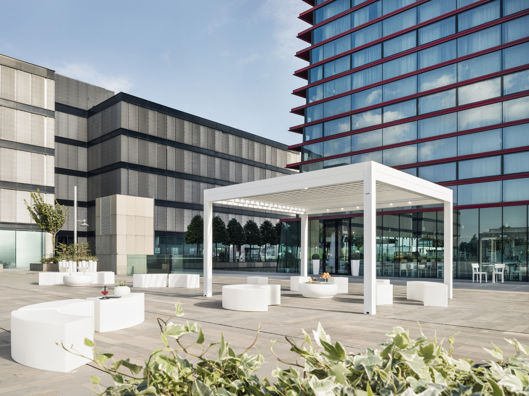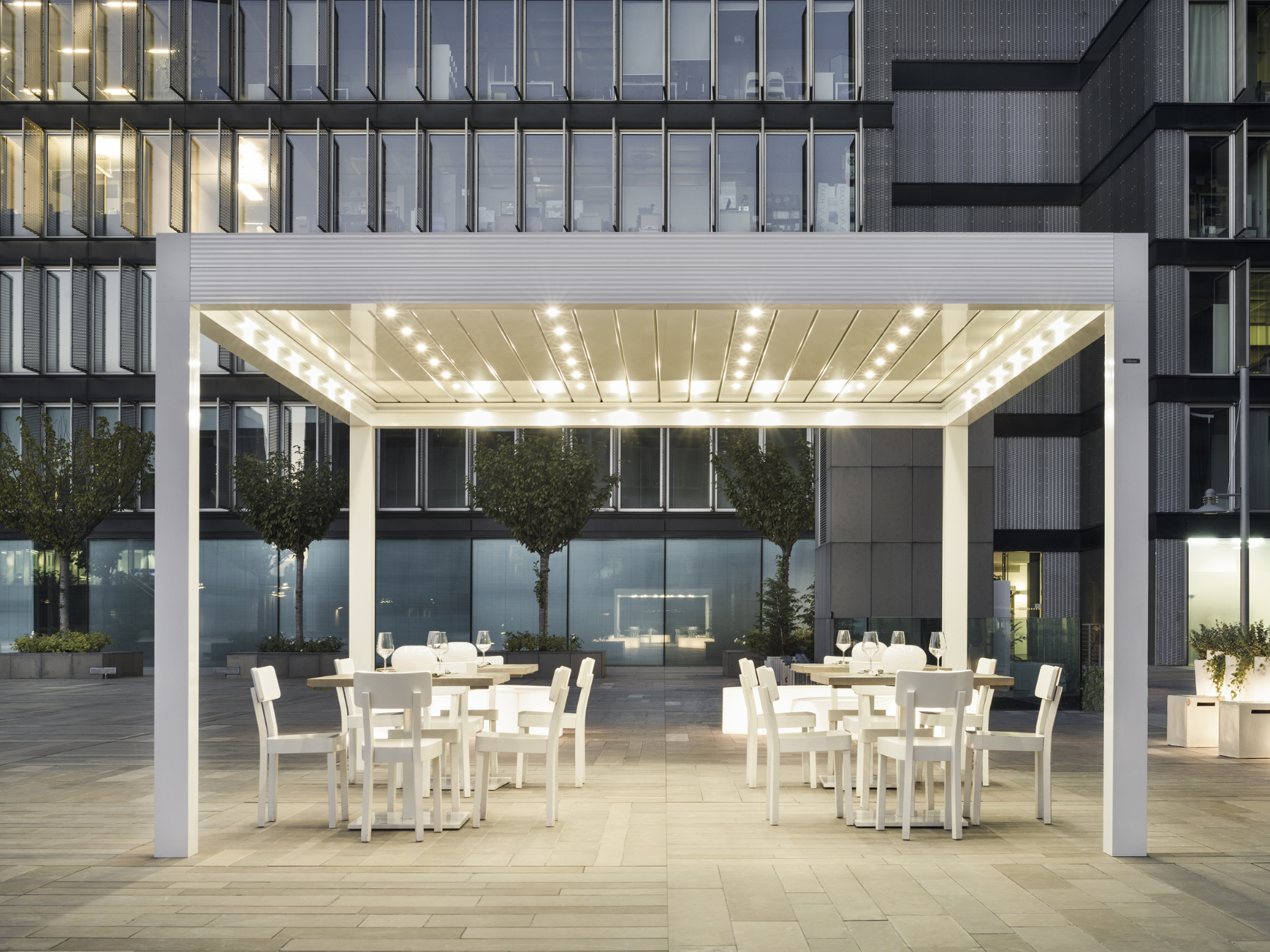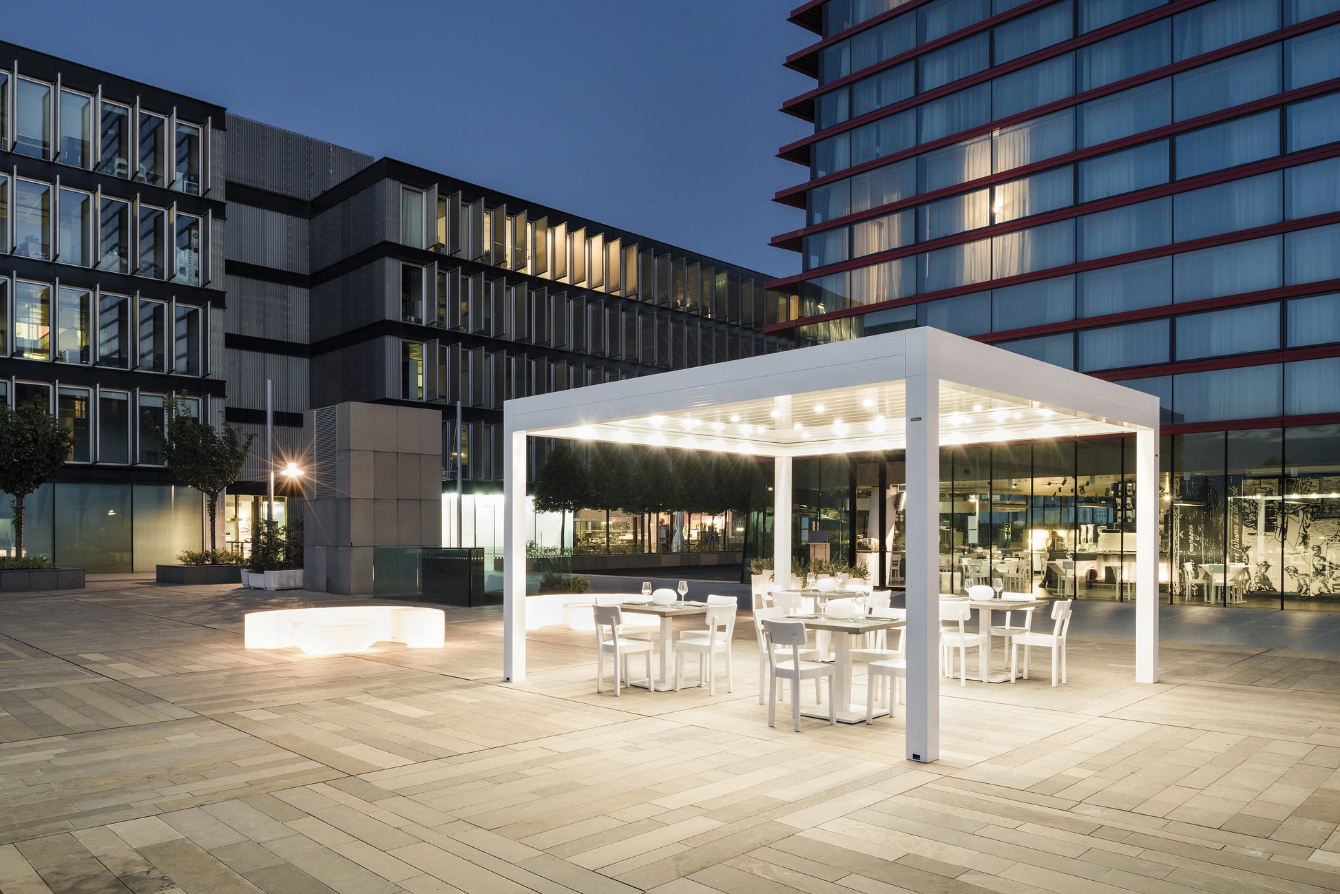L’elemento distintivo è la copertura a lame orientabili, progettata per adattarsi alle diverse esigenze metereologiche.
