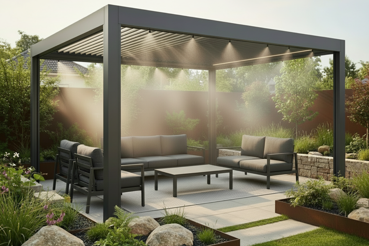 I profili integrano con eleganza schermature Zip e vetrate laterali, creando uno spazio fruibile tutto l’anno. L’illuminazione con spot sulle lame e strip RGB perimetrali aggiunge atmosfera e stile a ogni momento all’aperto.